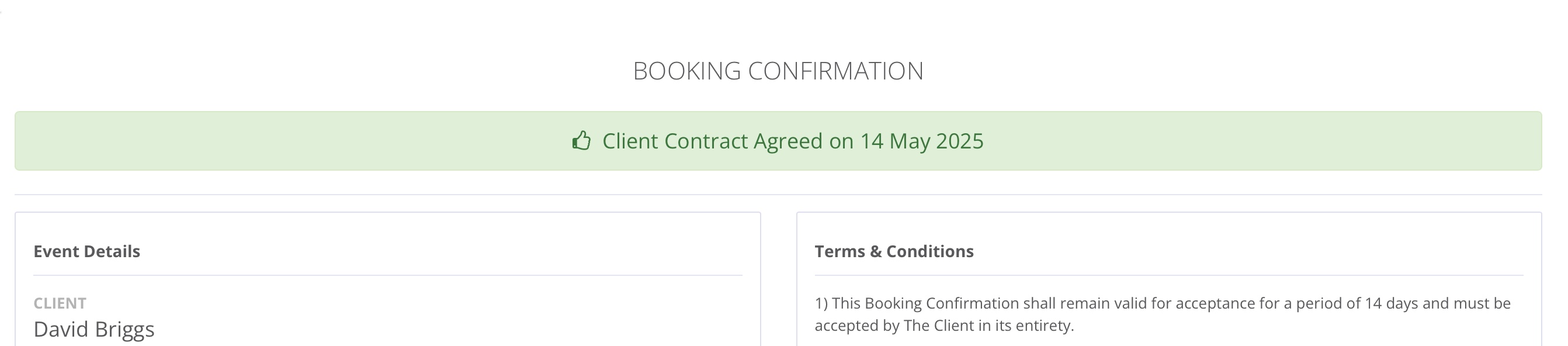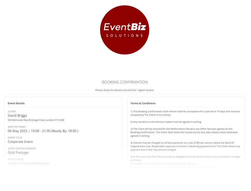 When you send a Booking Confirmation to a client, it will contain a link to the event information and your terms and conditions: